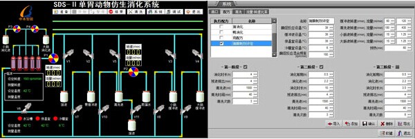 SDS-II單胃動物仿生消化系統由模擬消化器和控制系統組成。模擬消化器中透析袋內視為胃、小腸、大腸的內環境(消化環境),透析袋外視為毛細血管體液環境(吸收環境)。采用組態軟件技術通過電腦程控進入模擬消化器內的緩沖液自動輸入-排空-切換系統、消化液自動分泌系統、水解產物自動清洗系統、恒溫控制系統、混合強度自動控制系統、電子元件信號檢測系統等模塊,實現對豬禽胃腸道消化過程的全自動模擬。